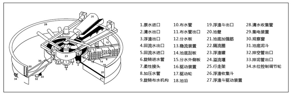 概述/OVERVIEW 高效浅层气浮设备主机是指气浮设备中的分离部分,其中包括:池体、浮渣收集装置、溢流调节装置、旋转进水布水机构 等。新型高效浅层气浮机与传统气浮机相比,改静态进水一静态出水为动态进水一静态出水,使悬浮物(SS)在相对静止的 环境中垂直浮在水面上,污水在净化池内仅需5-lOmin,处理效率极高。 应用范围/SCOPE OF APPLICATION 造纸废水 纺织工业废水 制糖工业废水 日用化工废水