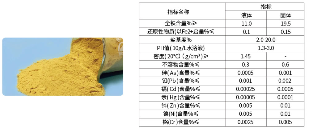 概述/OVERVIEW 聚合硫酸铁是一种性能优越的无机高分子混凝剂,形态形 状是淡黄色无定型粉状固体,极易溶于水,10%(质量)的是水溶 液为红棕色透明溶液,吸湿性。聚合硫酸铁广泛应用于饮用水、 工业用水、各种工业废水、城市污水、污泥脱水等的净化处理。